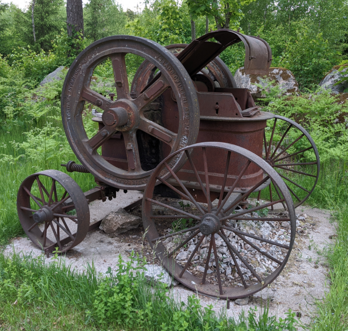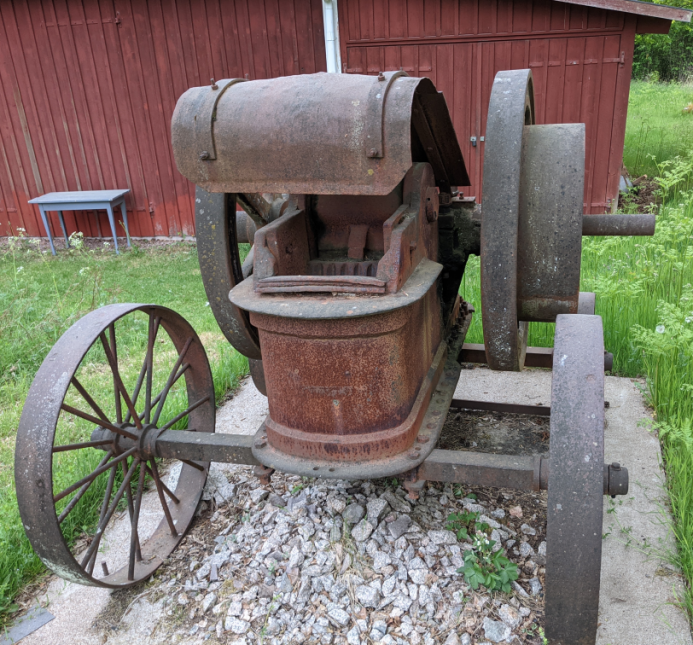 Krossen som du ser är tillverkad av Ystads gjuteri och mekaniska verkstad aktiebolag. Namnet är ingjutet i svänghjulet. Det står också ”ca 300 hwarf pr. minut”. Den är troligen tillverkad på 1920-talet och förmodligen använd vid rätningen av väg 23 på 1930-talet.